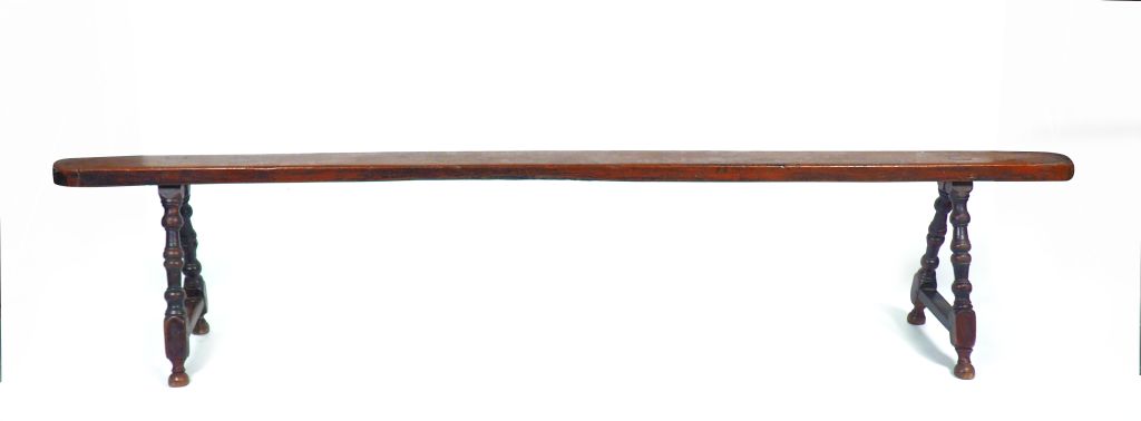 Banc de style Louis XIII en bois naturel. Dim. 51 x 249 cm.