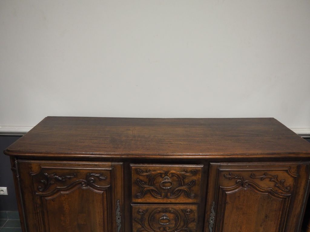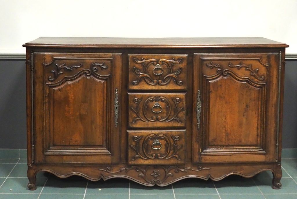 Buffet de style Louis XV en bois naturel mouluré et sculpté à décor de rinceaux ouvrant à trois tiroirs et deux portes. Dessus bois. Dim. 102 x 181 x 65 cm.