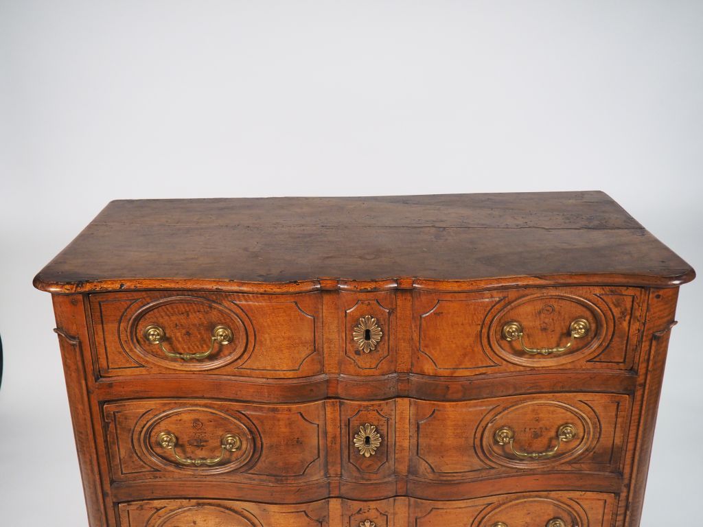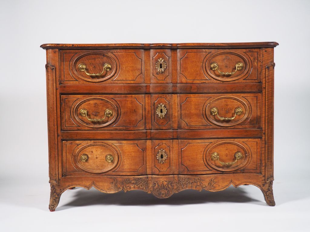 Commode Régence en noyer mouluré et sculpté ouvrant à 3 tiroirs, façade à arbalète. Dim. 88.5 x 126 x 58 cm.