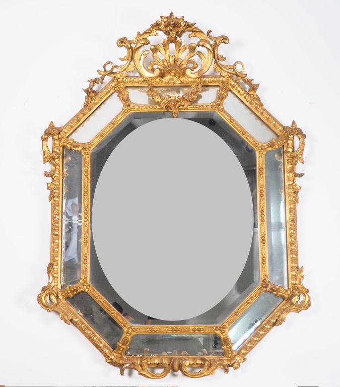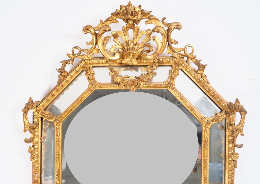 Glace à pareclose de style Louis XIV en bois et stuc sculpté et doré à décor de godrons, de perles et surmonté d'un fronton ajouré à décor de palmette, de rocailles et de fleurs. Dim. 140 x 106 cm. (Accidents)