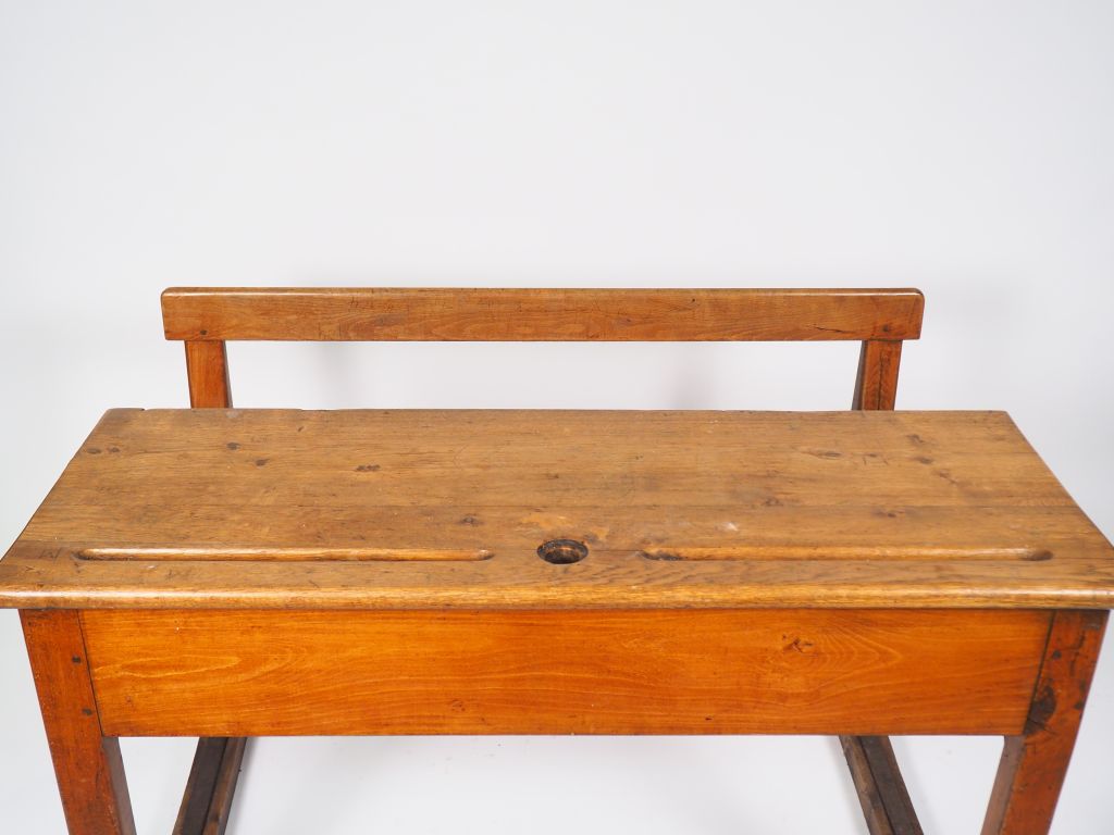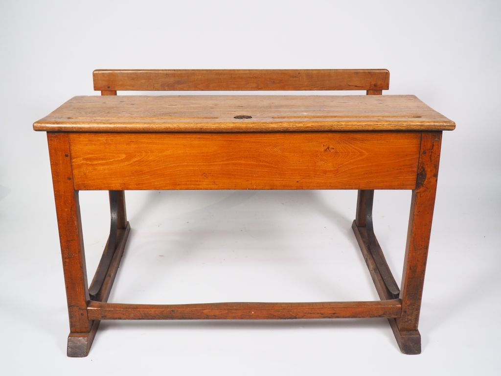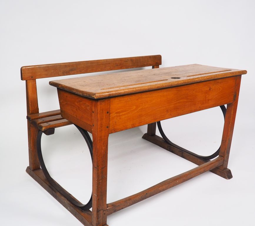 Pupitre d'écolier début XXème en chêne et fer forgé. Dim. 78 x 120 x 80 cm.