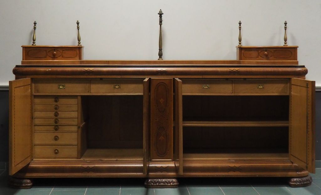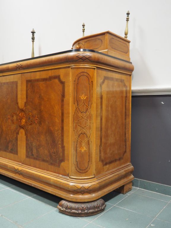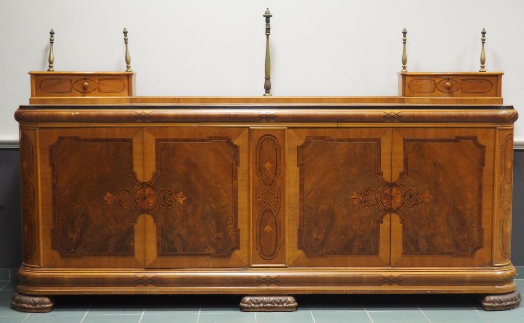 Superbe enfilade 1940 en marqueterie, à décor de rinceaux et de fleurs, ouvrant à quatre portes, dessus bois. Dim. 132 x 48 x 274 cm