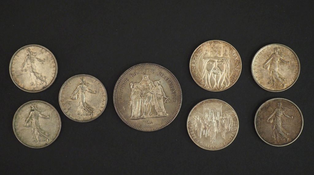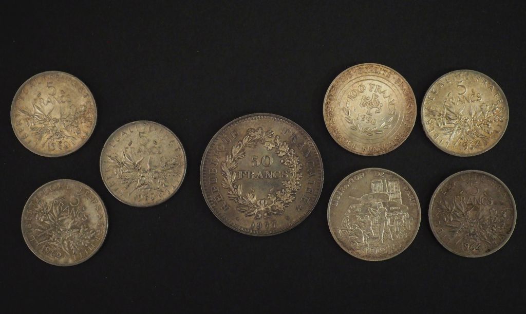 Ensemble comprenant : - une pièce de 100 Francs argent, 1994 - une pièce de 50 Francs argent, 1977 - cinq pièces de 5 Francs argent, 1960, 1962 (x2) et 1964 (x2) - une pièce de la monnaie de Paris 100 Francs argent, 1990 Poids. 120 g