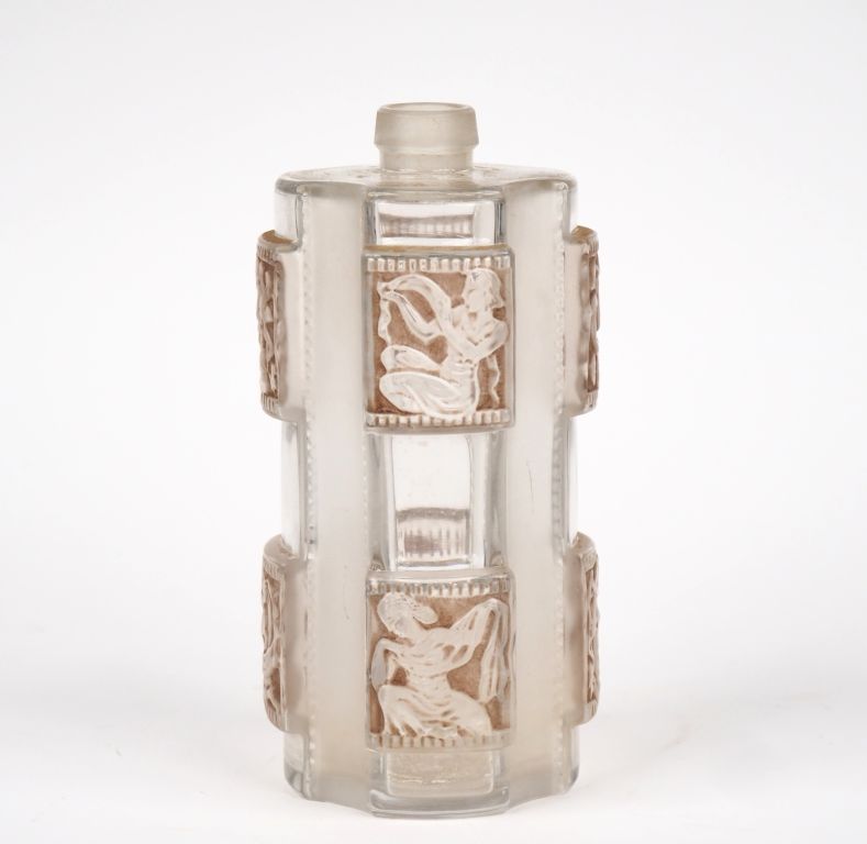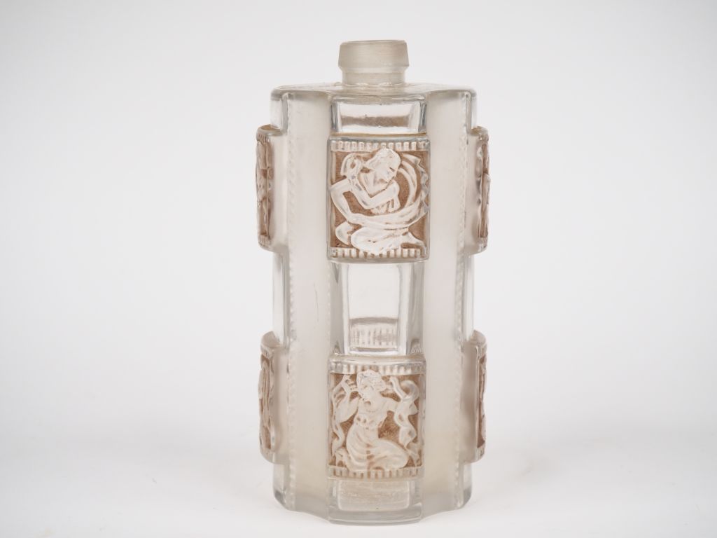 LALIQUE France. Flacon de garniture de toilette modèle "Hélène" en verre, à décor dans des cartouches de personnages de la mythologie. H. 20 cm Signé. (manque le bouchon).