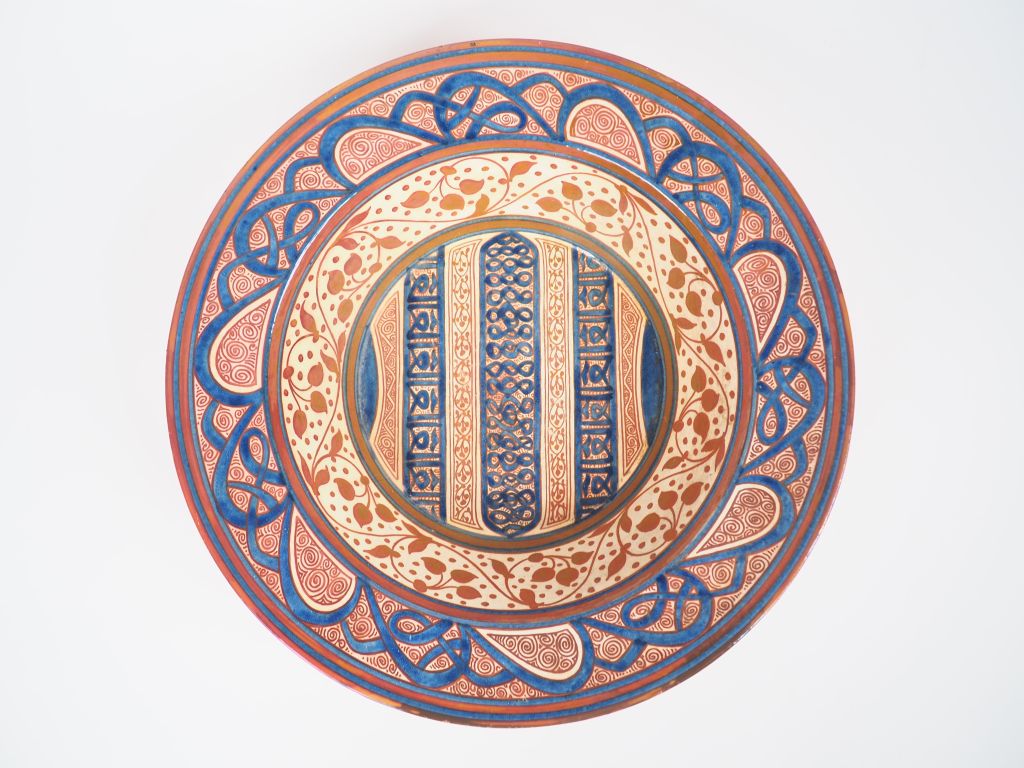 LENOBLE. Plat en faïence polychrome à décor hispano-mauresque. Signé sous la base. Dim. 9,5 x 35,5 cm. (petit éclat à l'émail)