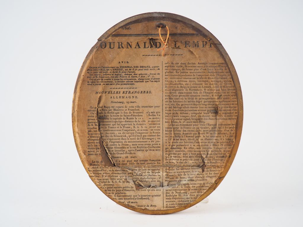 Plaque en émail peint de forme ovale polychrome avec rehauts d’or représentant l’Annonciation, bordure à décor de rinceaux en relief. Limoges, fin du XVIIe siècle Hauteur : 16 cm – Largeur : 12 cm Dans un cadre en bois doré (petits manques, accidents et restaurations) Expert : Laurence Fligny.