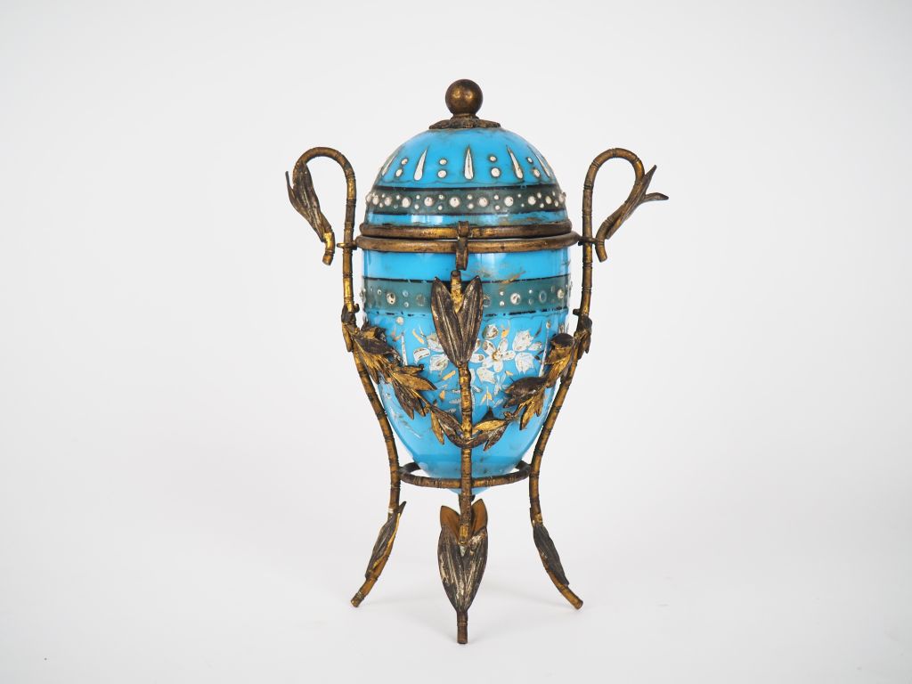Boite Napoléon III en émail polychrome et laiton en forme d'œuf. H. 17 cm