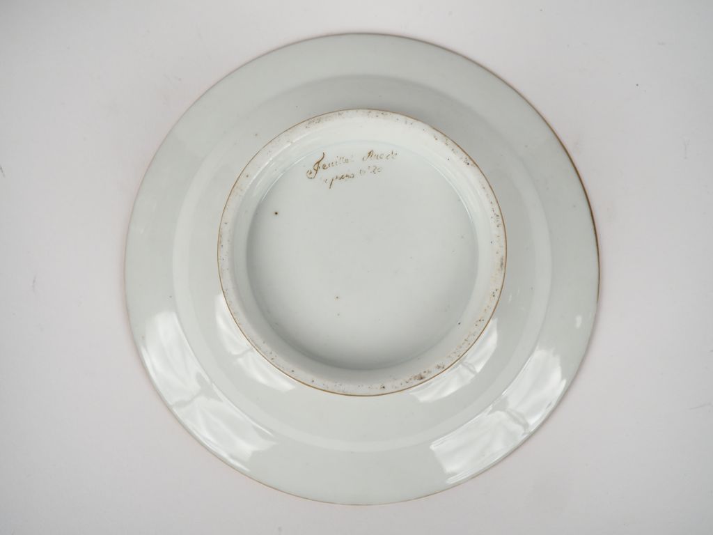 Tasse et sous tasse Jasmin de style Empire en porcelaine à décor dans une réserve de paysage animé, motifs ornementaux dorés sur fond bleu