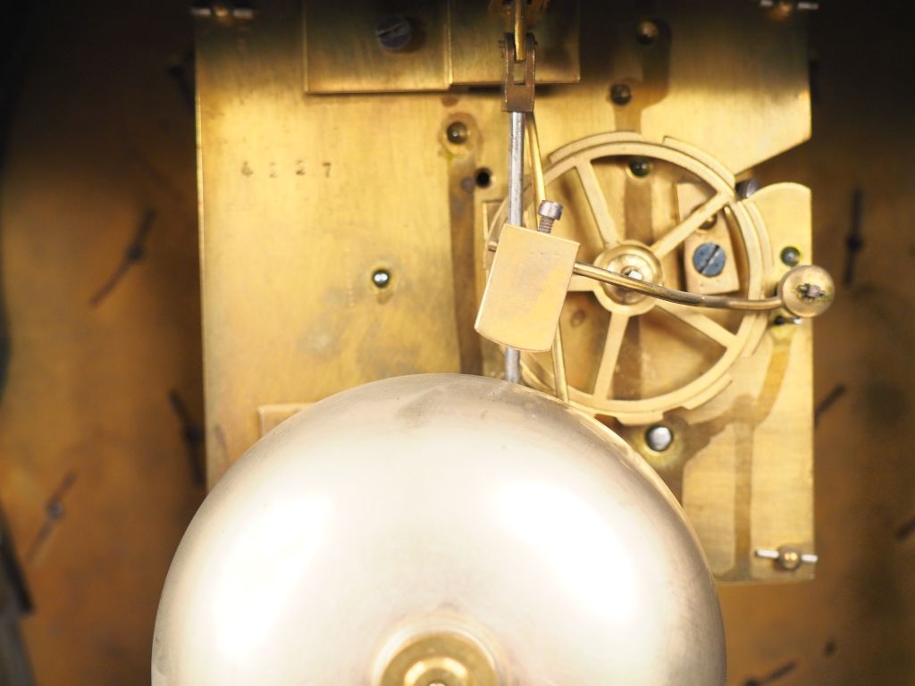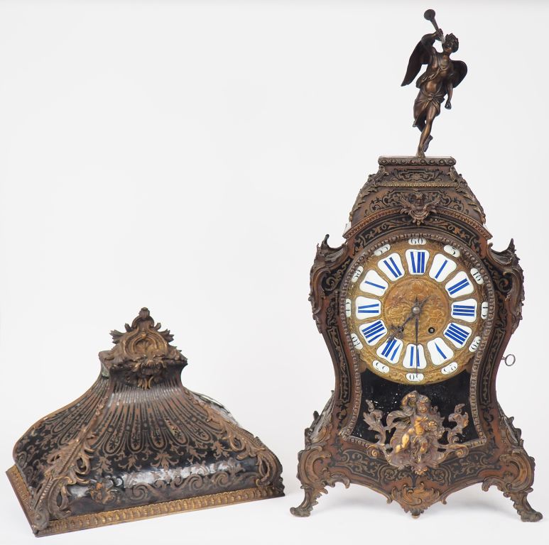 Cartel Napoléon III de style Louis XV en marqueterie Boulle et ornementation de bronze, à décor de Putti et de rinceaux, surmonté d'une allégorie de la renommée. Dim. (sans le socle) : 73 x 37,5 x 14,5 cm. Dim. du socle : 27 x 39,5 x 19 cm.