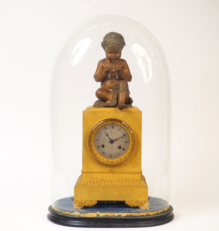 Pendule borne Restauration en bronze à patine médaille et doré, figurant Pan enfant sur un tertre. H. 48 cm (renfoncement à la base)