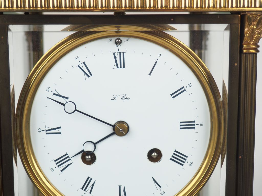 Pendule cage XIXème de style Louis XVI en verre et métal, à décor de deux colonnes, cadran émaillé signé L'EPEE. Dim. 34 x 19 x 16 cm.