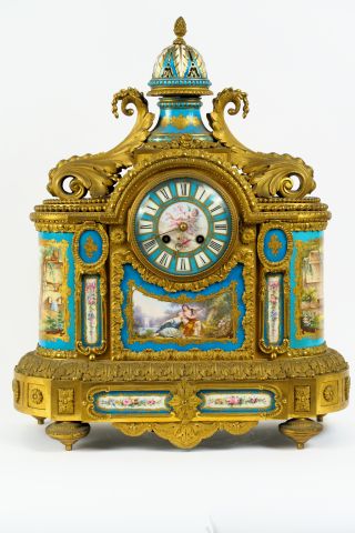 Pendule Napoléon III de style Louis XVI en bronze ciselé et doré, ornée de plaques de porcelaine tendre, à décor de scènes galantes et de bouquets de fleurs polychromes. 48,5 x 40 x 17 cm