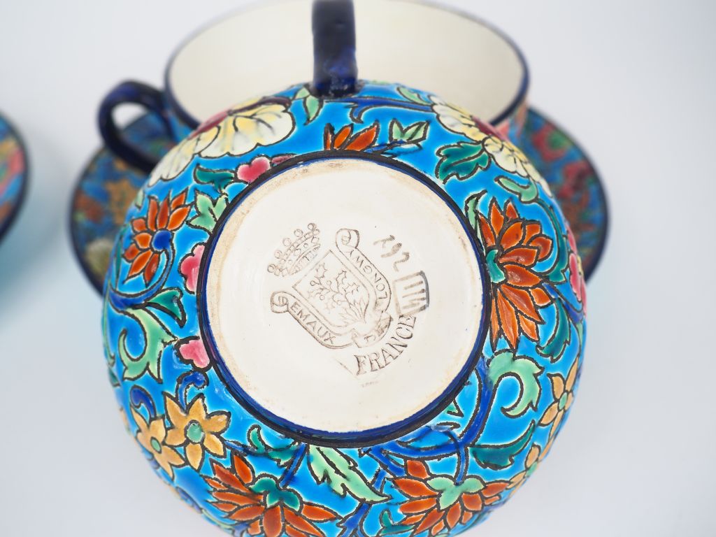 Lot de LONGWY. Paire de déjeuners en émaux polychromes à décor de fleurs. Sig au prix de 30 à 40 € en vente aux enchères par l'hôtel des ventes Primardeco