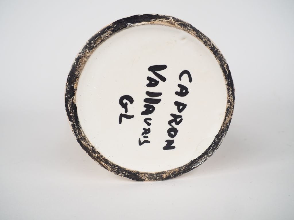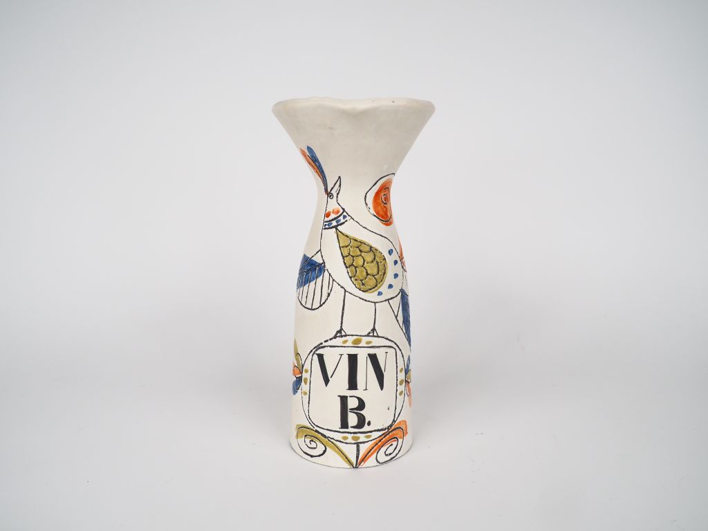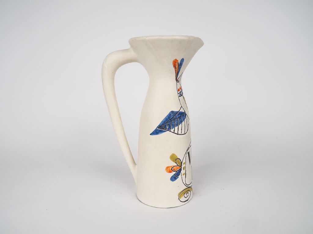 Roger CAPRON. Pichet à vin blanc en céramique de Vallauris à décor polychrome d'un oiseau. Signé. H. 28 cm. (cheveux sur l'anse).