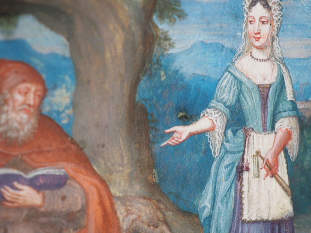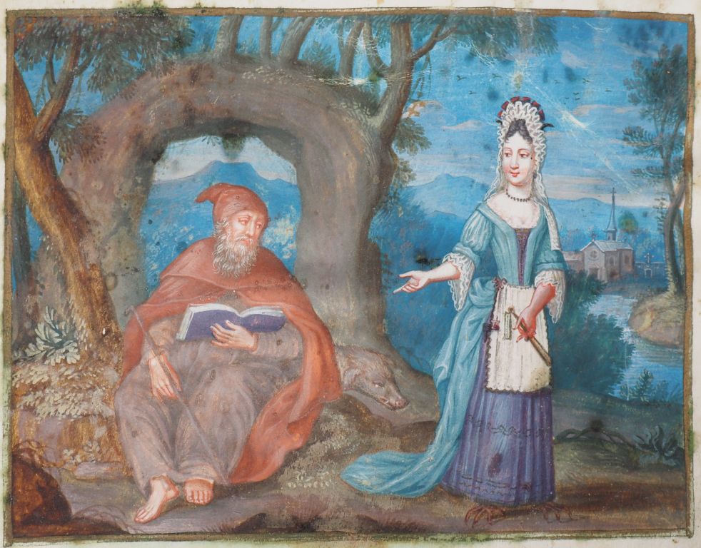 Ecole française XVIIème. "la tentation de Saint Antoine" Gouache sur vélin Dim. 8,5 x 10,5 cm (taches)
