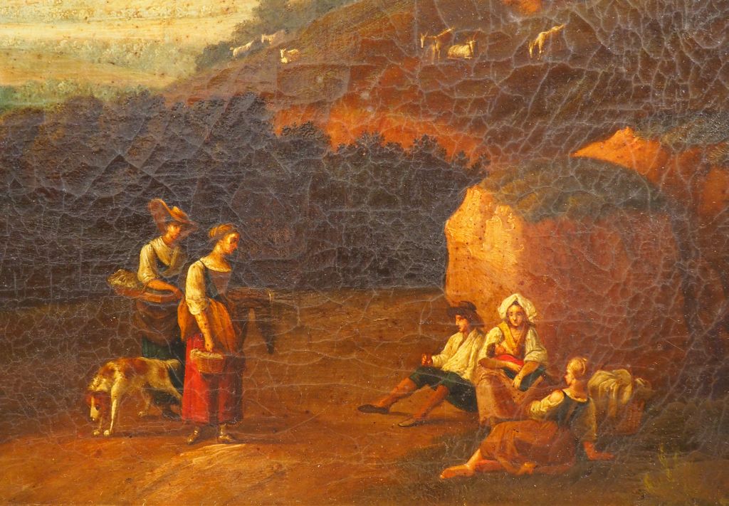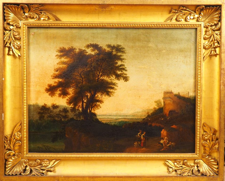 Ecole italienne début du XIXème "Paysage animé avec personnages et ruines." Huile sur toile Dim. 73,5 x 97 cm (réentoilée, accident au cadre) Expert : Cabinet TURQUIN - 69,rue Sainte-Anne 75002 Paris Tél : 01 47 03 48 78