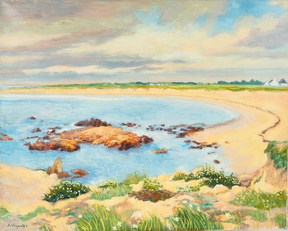André VIGNOLES. "La plage à la pointe de la torche". Huile sur toile signée en bas à gauche et titrée au dos. Dim. 37,5 x 92 cm.