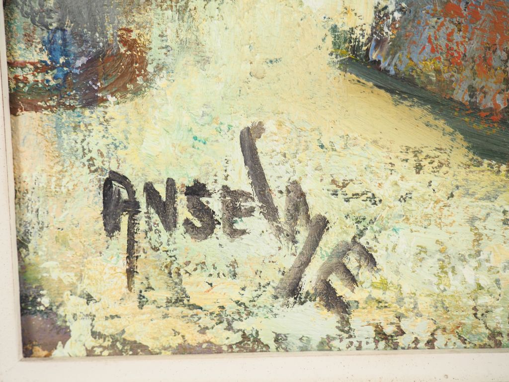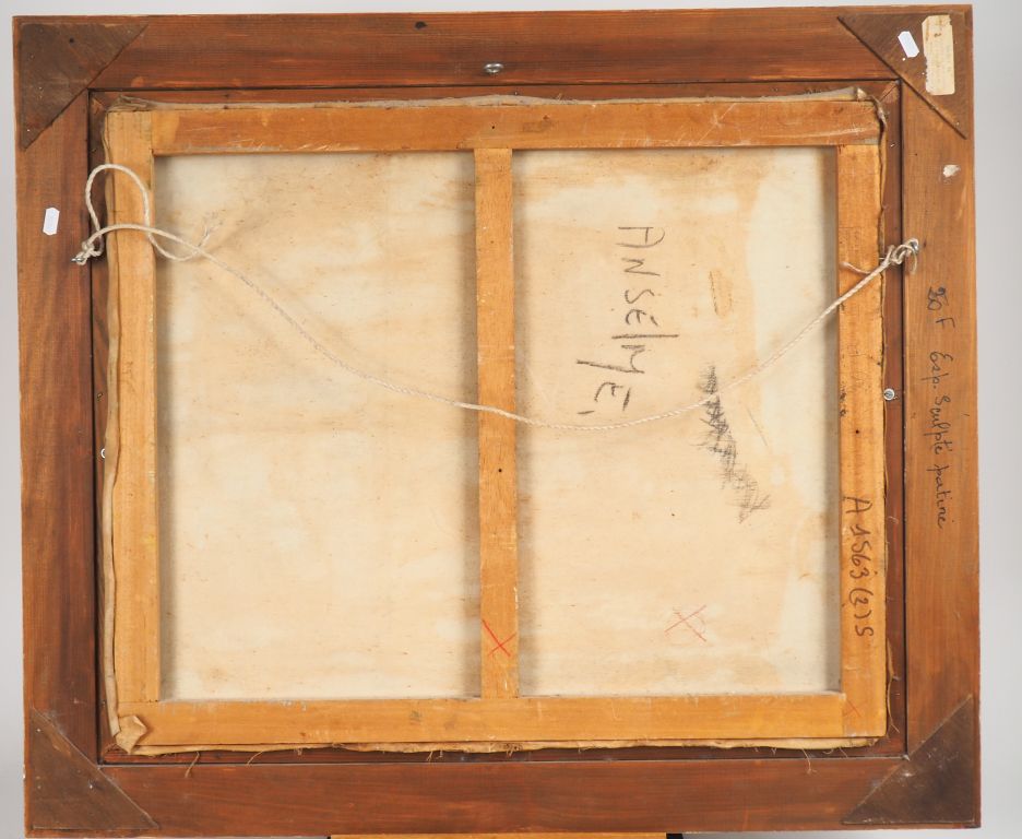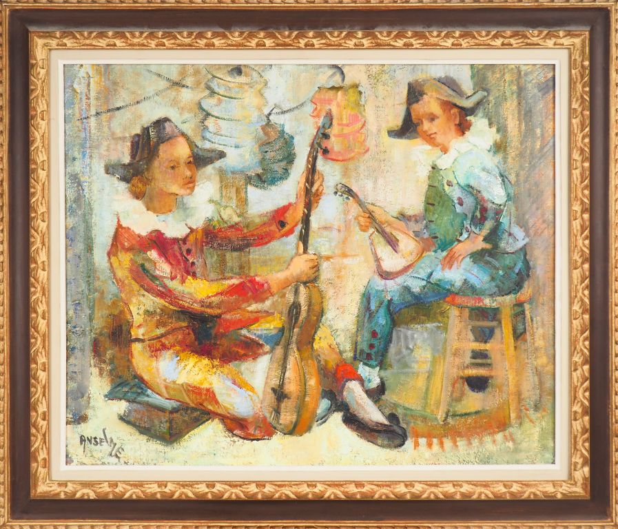ANSELME. "Arlequins musiciens". Huile sur toile, signée en bas à gauche. Dim. 60 x 73 cm.
