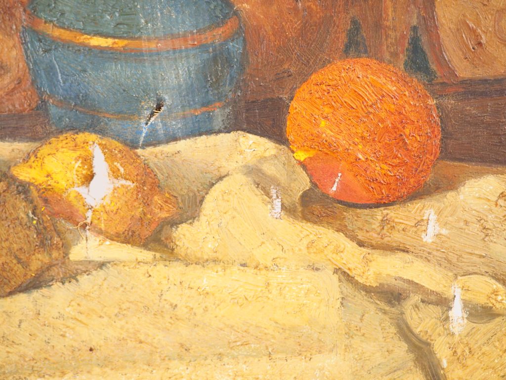 Ecole française fin XIXème début XXème. "Nature morte aux oranges". Huile sur toile. Dim. 50 x 61 cm. (accident).