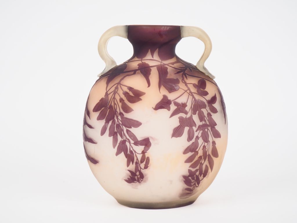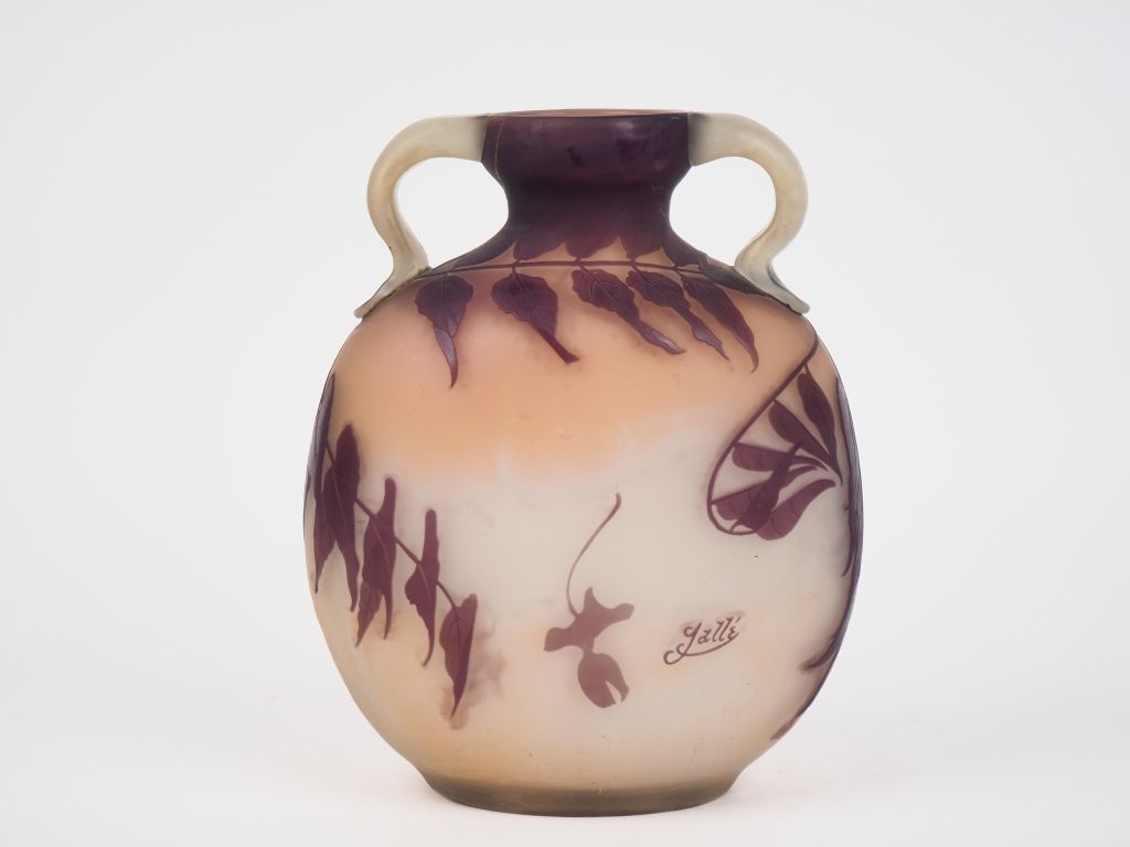 GALLE. Vase ovoide à panse applatie à décor gravé en camée à l'acide de glycine mauve sur fond blanc nuancé de rose, anses appliquées à chaud. (col accidenté et recollé) H. 31 cm Signé