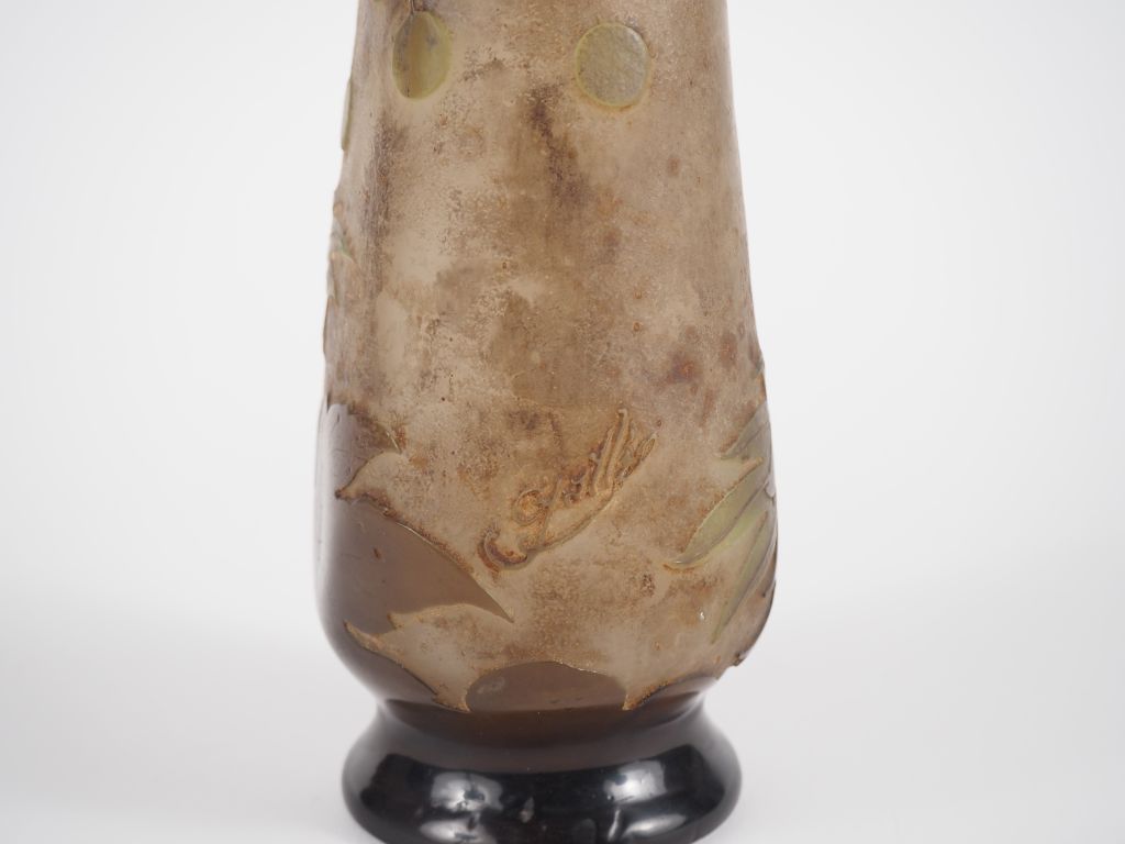GALLE. Vase sur piédouche en verre à décor gravé en camée et dégagé à l'acide de feuillage et de fleurs. Signé. H. 25,5 cm.