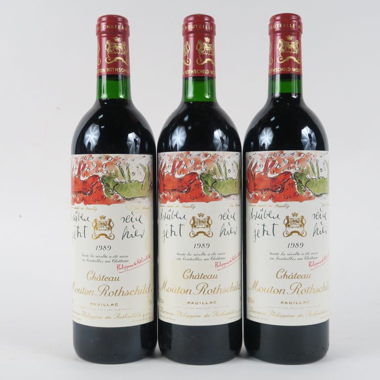 Lot de 3 BOUTEILLES CHÂTEAU MOUTON ROTHSCHILD 1er GCC PAUILLAC - 1989 - BG au prix de 850 à 950 € en vente aux enchères par l'hôtel des ventes Primardeco