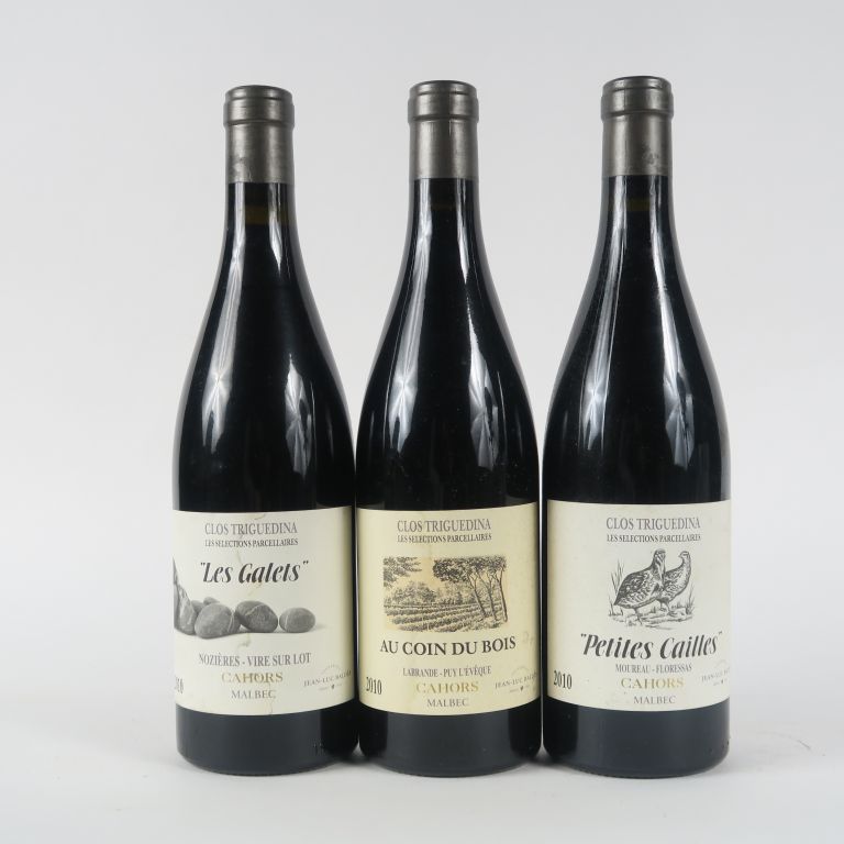 3 BOUTEILLES CLOS TRIGUEDINA JEAN LUC BALDES 2010 : 1 LES PETITES CAILLES - 1 AU COIN DU BOIS - 1 LES GALLETS