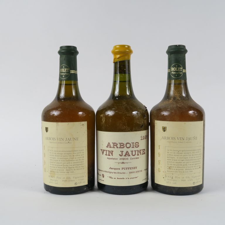 Lot de 3 BOUTEILLES VIN JAUNE : 2 ROLLET 1990 - 1 PUFFENEY 1997 au prix de 50 à 60 € en vente aux enchères par l'hôtel des ventes Primardeco