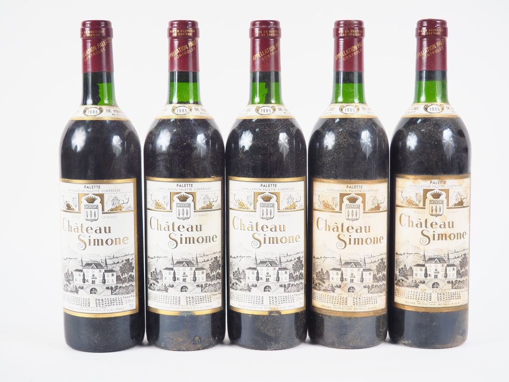Lot de 5 BOUTEILLES CHÂTEAU SIMONE 'PALETTE' ROUGE - 1985 - BG/2 ELF au prix de 80 à 120 € en vente aux enchères par l'hôtel des ventes Primardeco