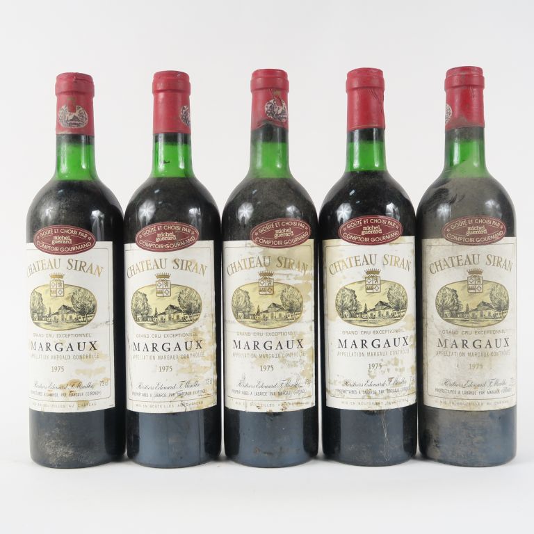 Lot de 5 BOUTEILLES CHÂTEAU SIRAN MARGAUX - 1975 - 1 BG/2 LB/2 HEP au prix de 50 à 60 € en vente aux enchères par l'hôtel des ventes Primardeco