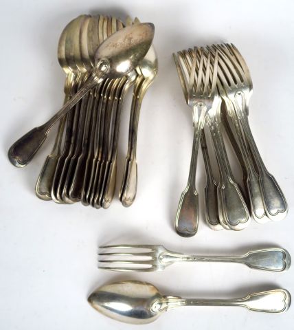 CHRISTOFLE. 13 couverts et 2 cuillères en métal argenté, modèle au filet