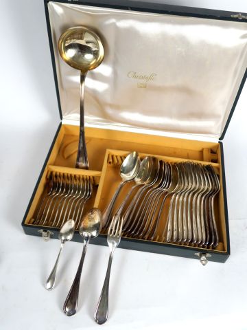 CHRISTOFLE. Ménagère en métal argenté comprenant 12 couverts, 12 petites cuillères et une louche. Dans son coffret