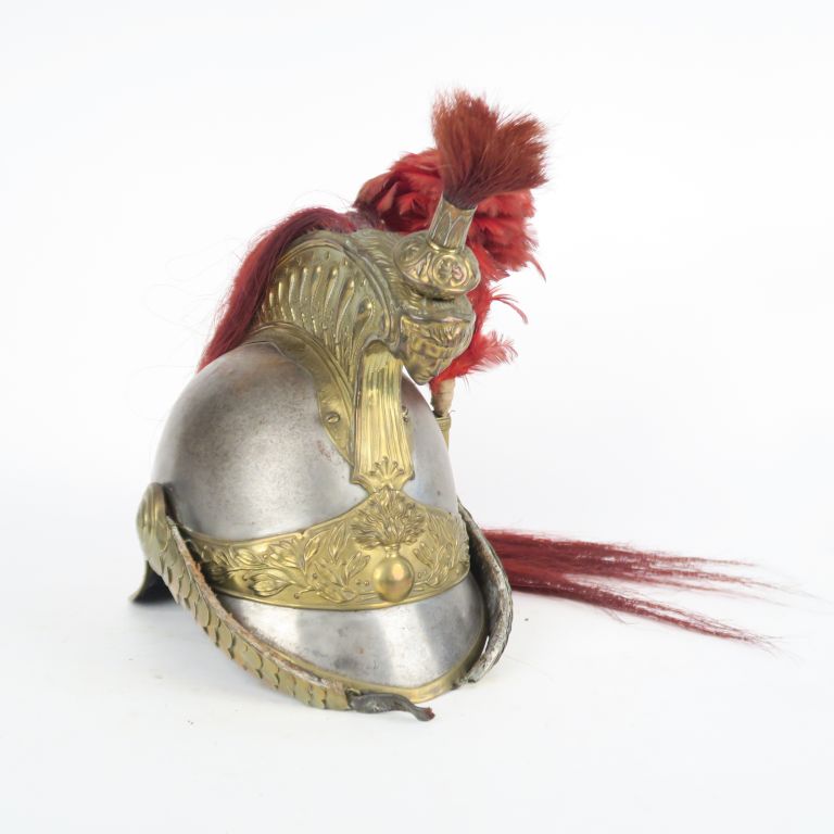 Casque modèle 1874 de trompette de 7e cuirassiers. Bombe en fer, matriculée, frappée « 7 C », datée « 74 » et marque du fabricant Alexis Godillot . Marmouset, cimier à godrons, bandeau à la grenade, jugulaires à anneau doublées de cuir et jonc en laiton. Houppette de marmouset et crinière avec tresse, en crin rouge. Visière et nuquière doublé de cuir. Coiffe intérieure en cuir. Présenté avec un plumet écarlate. A.B.E. (cassure à l’attache de jugulaire).