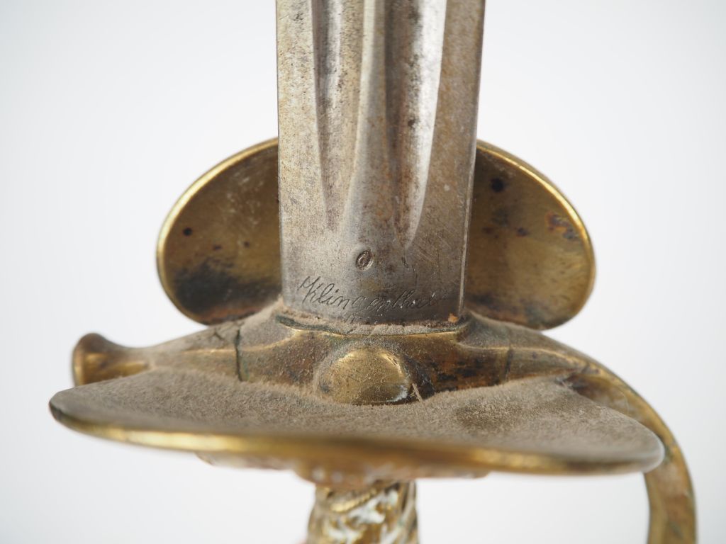 Épée de sous-officier de gendarmerie modèle 1872. Monture en laiton, clavier au faisceau de licteur sur faisceau de drapeaux. Lame droite à gouttières, signée de Klingenthal. Fourreau en cuir à chappe en laiton (manque la bouterole). Longueur : 98 cm. IIIe République. On joint un fleuret.