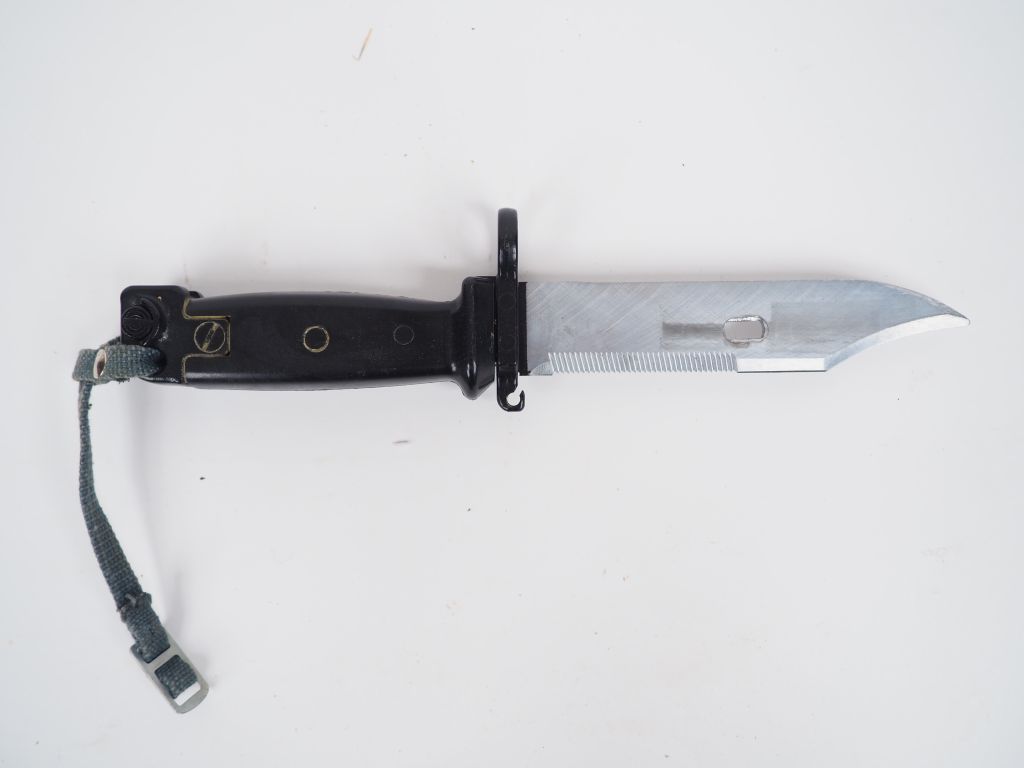 Lot de 5 armes blanches dont un poignard probablement tibétain dans son fourreau en tôle de cuivre rehaussé de décors en laiton, une baïonnette soviétique moderne, une baïonnette allemande 84/98 du 3éme type, plaquettes bois, fourreau pas au numéro, réceptionnée 1938, un poignard traditionnel scandinave Pukko dans son fourreau et une baïonnette réglementaire argentine modèle 1909. (Etat 1-état neuf)