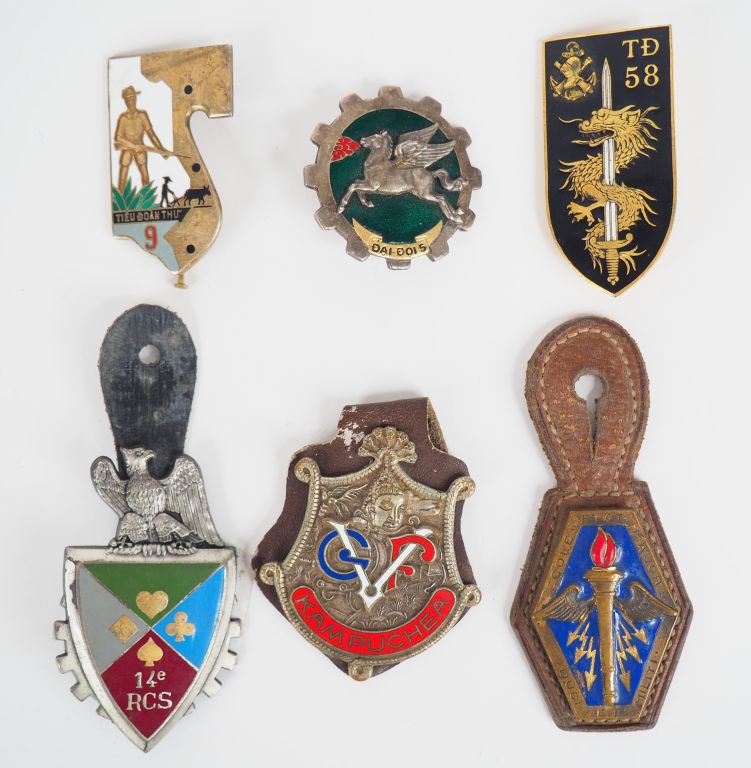 Lot d’insignes régimentaires extrême orient dont un garde voie Cambodgien, deux Tieu-Doan (58 et 9) et un Dai-Doi (5), on y joint deux insignes régimentaires français. (Etat 1-état neuf)