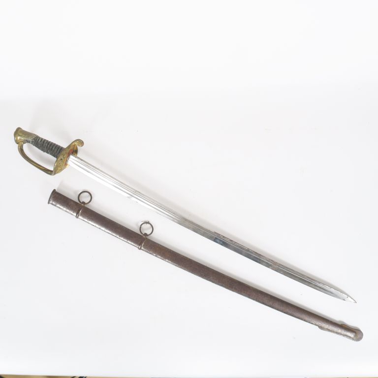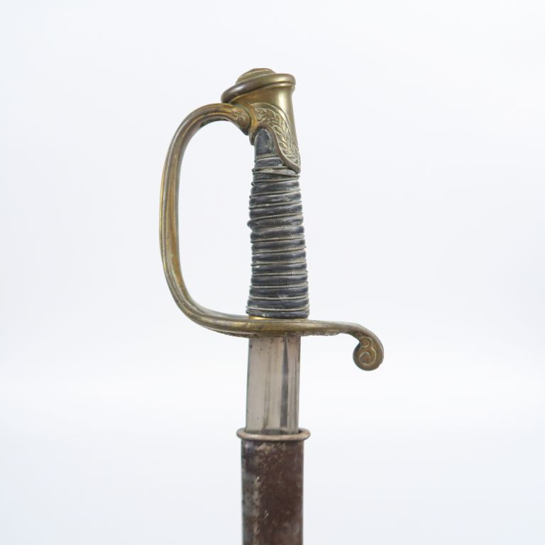 Sabre d’adjudant d’infanterie type 1855. Poignée en corne avec filigrane. Monture en laiton, garde à une branche ajourée. Lame cintrée à gouttière et pans creux. Fourreau en tôle de fer à deux bracelets. E.M. (Fortes oxydations)