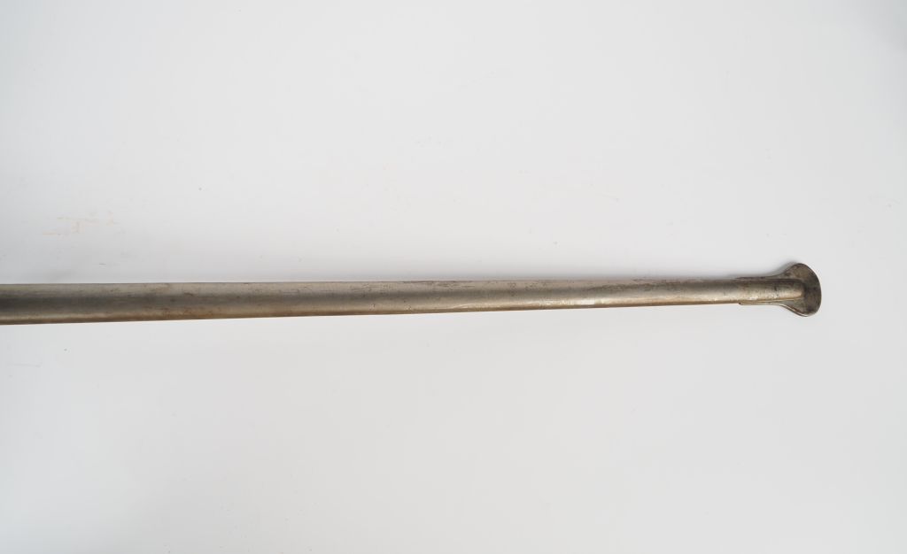 Sabre de cavalerie de ligne modèle 1854. Poignée recouverte de cuir avec filigrane. Monture en laiton, garde à quatre branches. Fourreau en tôle de fer à deux bracelets, un matriculé. Longueur : 120 cm. A.B.E. (Lame bloquée non examinée)