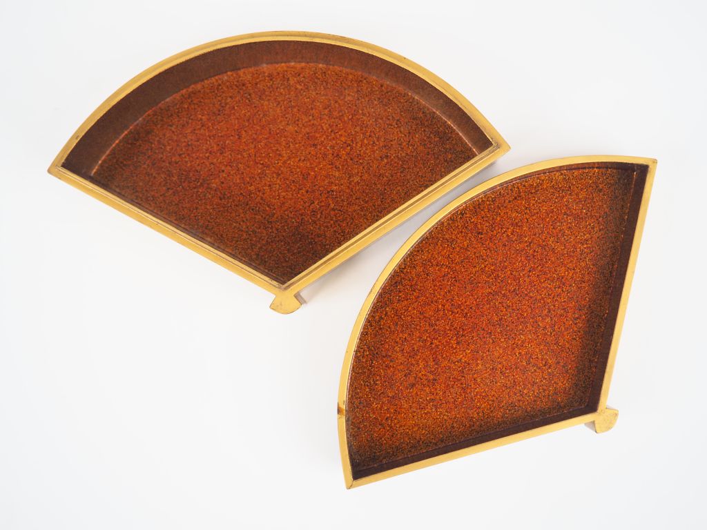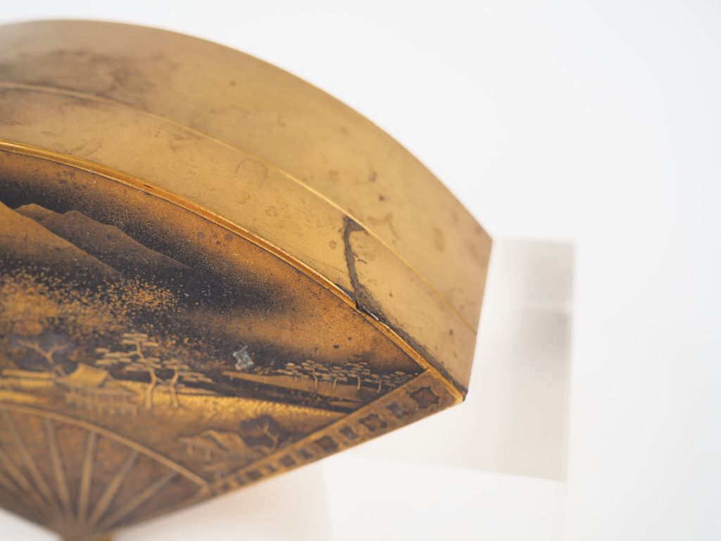 Boite en forme d'éventail finement décorée en Hira e taka maki e sur fond noir d'un paysage lacustre entouré de pics montagneux , intérieur en laque Nashiji. Japon période Meiji largeur : 15,7 cm (petite usure)