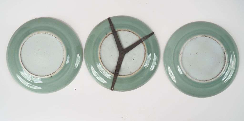Ensemble de trois assiettes en porcelaine de Canton à décor en émaux de la famille rose de jeunes femmes et de serviteurs aux abords d'un pavillon, de papillons et de fleurs. Chine vers 1880-1900 Diam. 24,7 cm (infimes égrenures)
