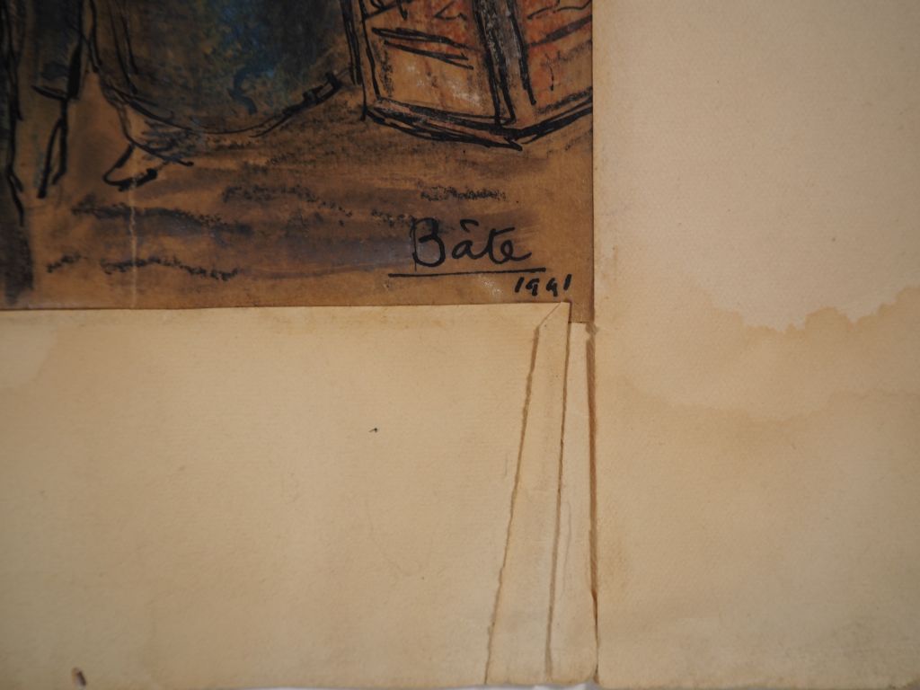 Louis Robert BATE (1898-1948, grand prix de l'Indochine en 1938). "Entrée de ville chinoise animée". Spéctaculaire encre et couleurs sur papier signée et datée 1941 en bas à droite, situé en bas à gauche. Dim. 67 x 103 cm.