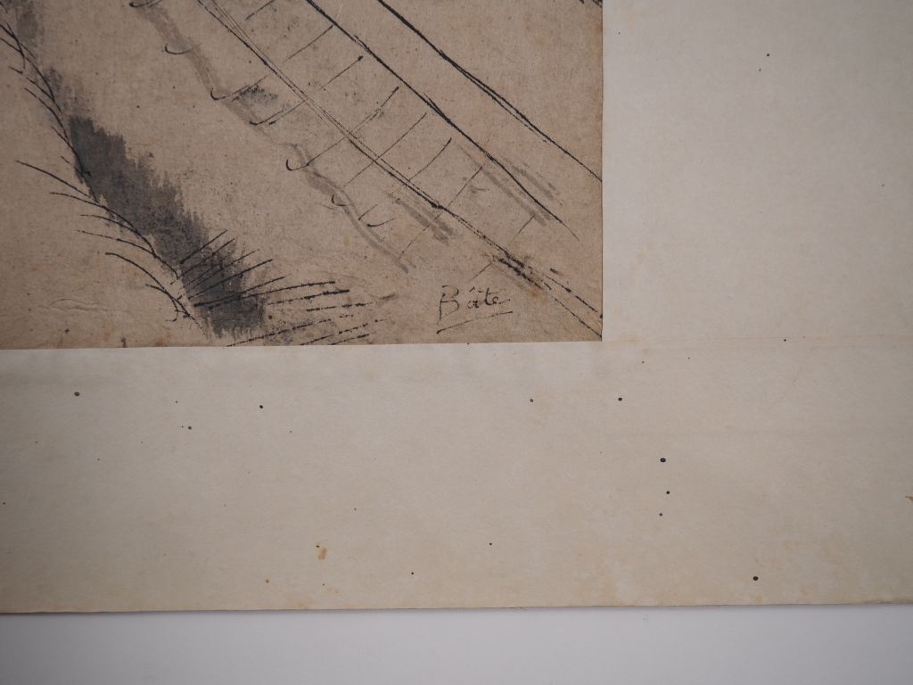 Louis Robert BATE (1898-1948, grand prix de l'Indochine en 1938). "Voie ferrée dans les montagnes chinoises". Encre et lavis sur papier signée en bas à droite. Dim. 46,5 x 55 cm.
