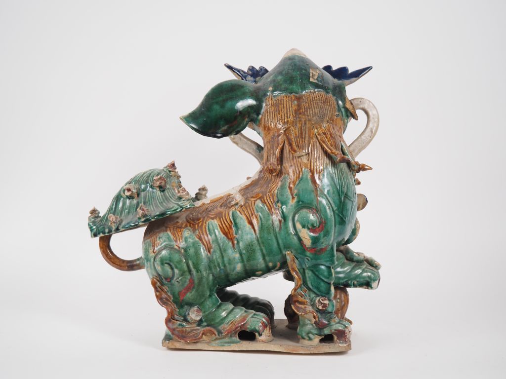 Vietnam, vers 1930 Important sujet en céramique émaillée bleu, vert et beige, représentant un lion bouddhique assis, la patte posée sur le lionceau. Dim. 48 x 48 cm (Manque une oreille, accidents)