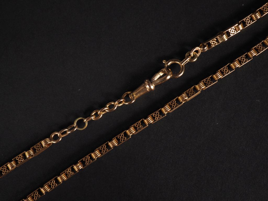 Giletière en or jaune 750, composée de maillons cannelés et ajourés alternés. Long. 38 cm Poids tel. 18,28 g (un maillon en métal)