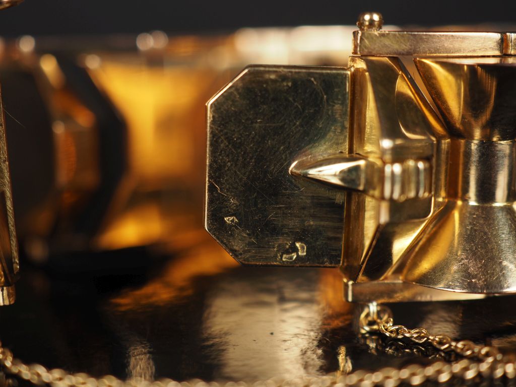 Important bracelet articulé de style 1940 en or jaune 750, à décor de maillon facettés et balustres alternés. Chainette de sécurité. Larg. 2,2 cm Poids. 102,90 g