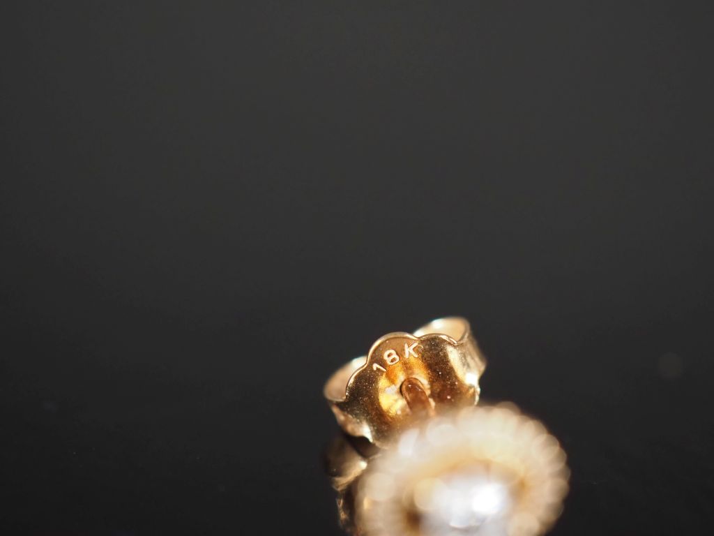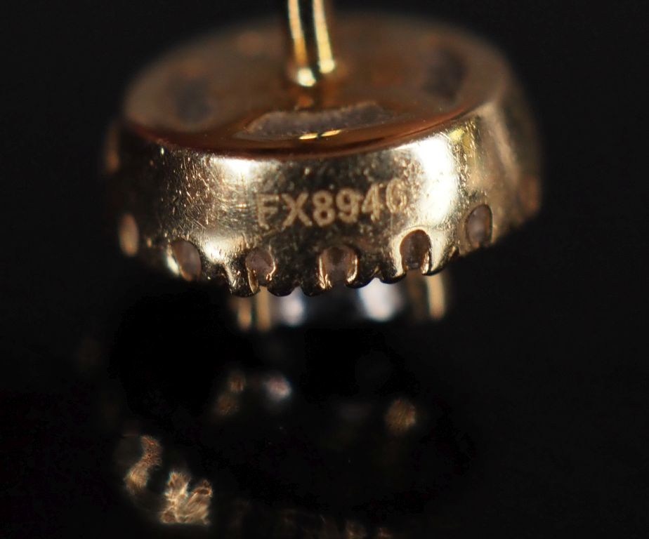 MAUBOUSSIN Paire de puces d'oreilles de forme ovale en or jaune 750, serties en leur centre d'un diamant pesant environ 0,04 ct entouré d'une couronne de petits diamants. Signées. 6,7 x 5,8 mm Poids tel. 1,88 g Dans leur écrin.