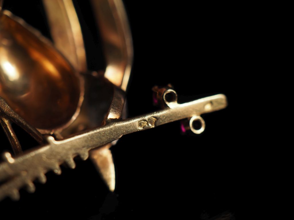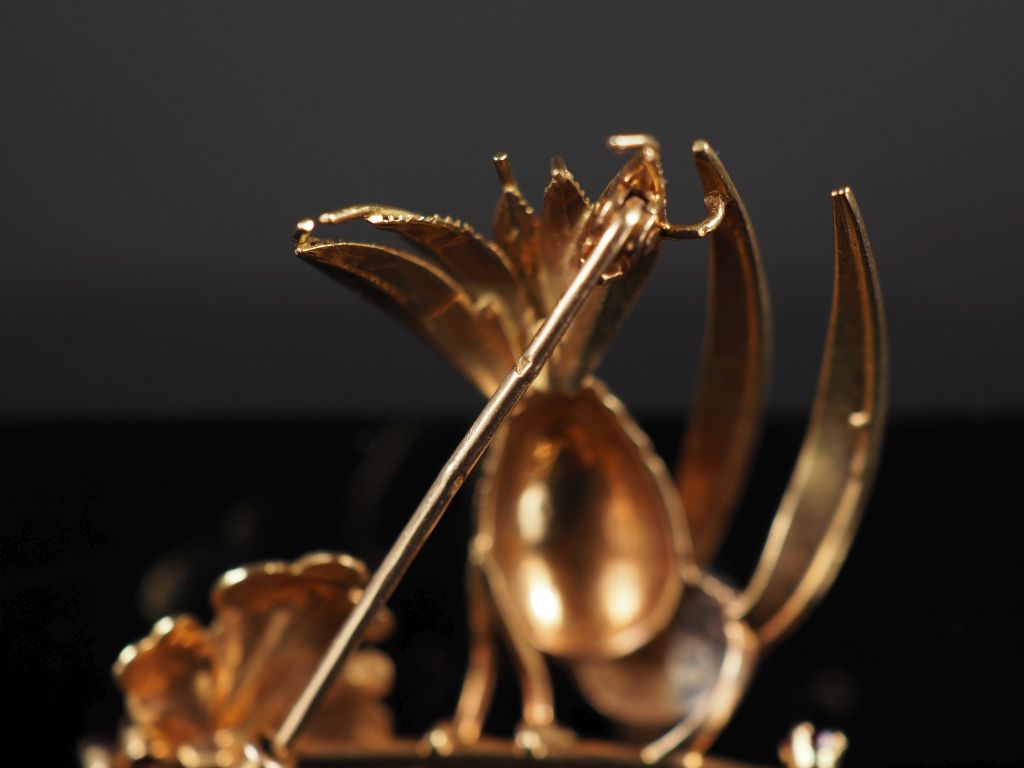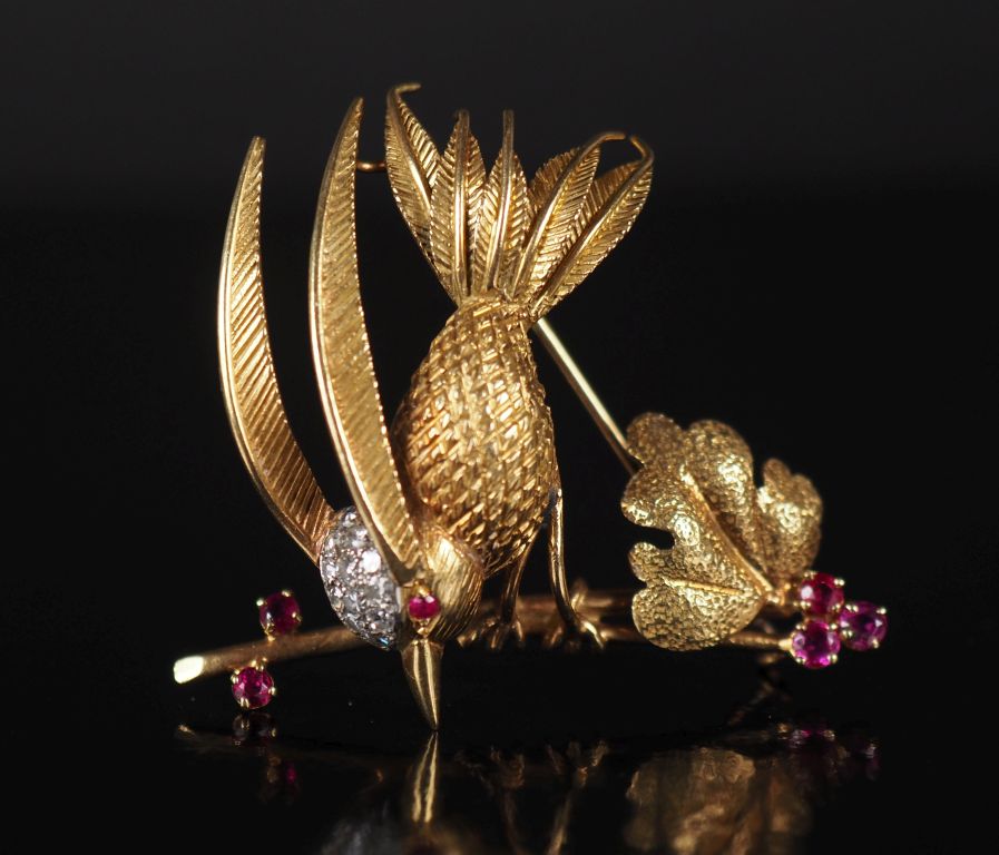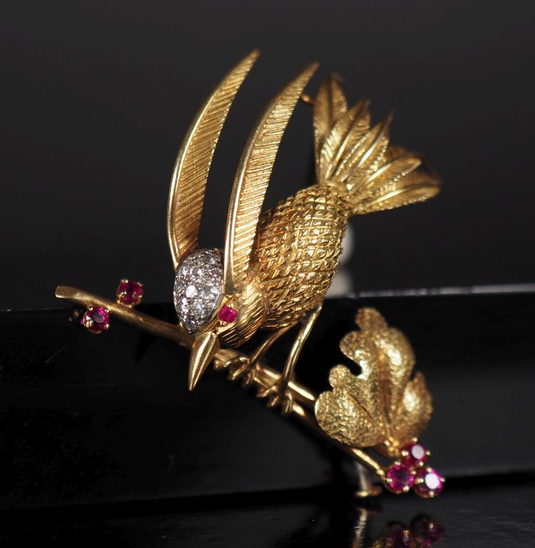 Ravissante broche en or jaune 750 et platine figurant un oiseau branché et agrémentée de petits diamants et pierres roses. 4,2 x 3,8 cm Poids tel. 9,33 g