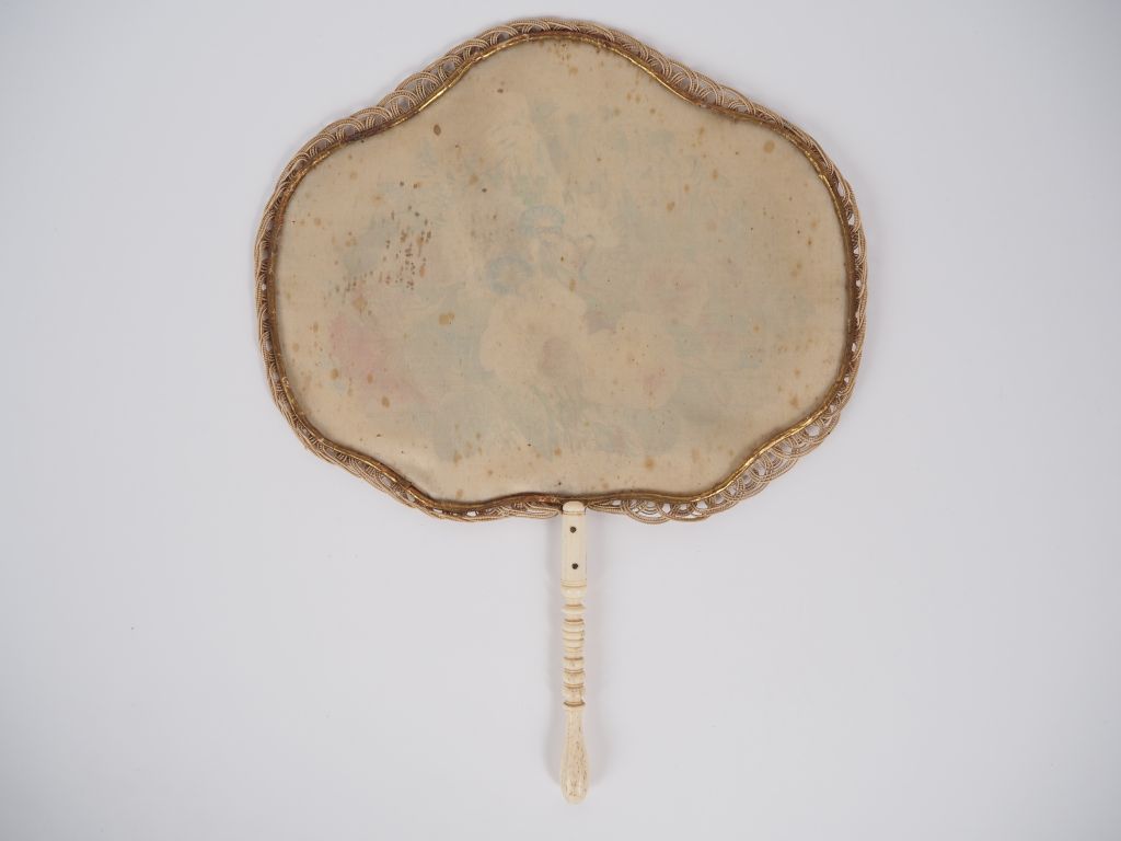 Ecran à main XIXème. Manche en os. Décor imprimé de fleurs et de papil...