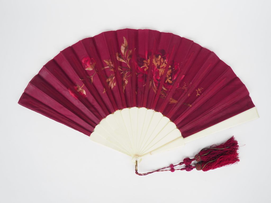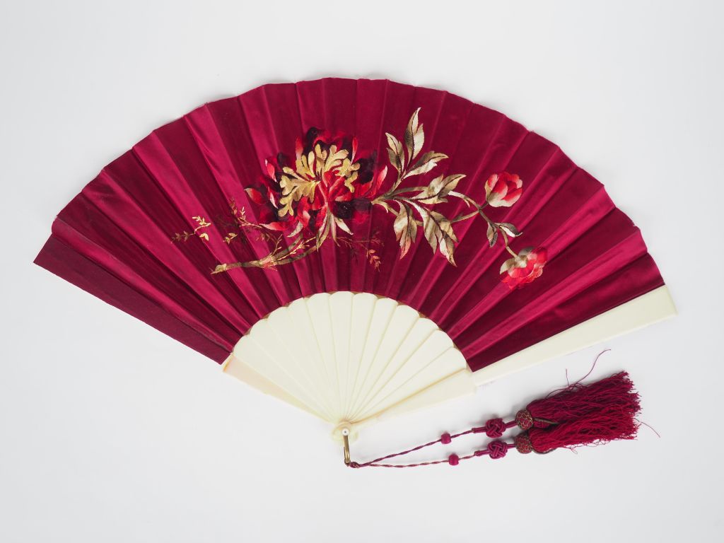 Eventail 1900 à 13 brins +2 MB. Monture en ivoire. Feuille brodée de jeté de fleurs sur satin pourpre. 33 cm. CITES.