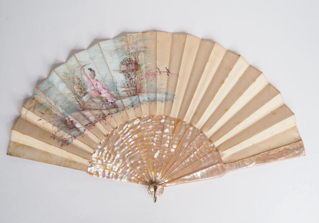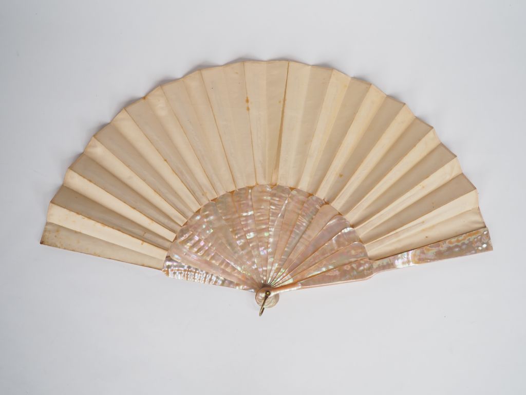 Eventail 1900 en nacre, à feuilles pliées, décor gouaché sur soie de ...